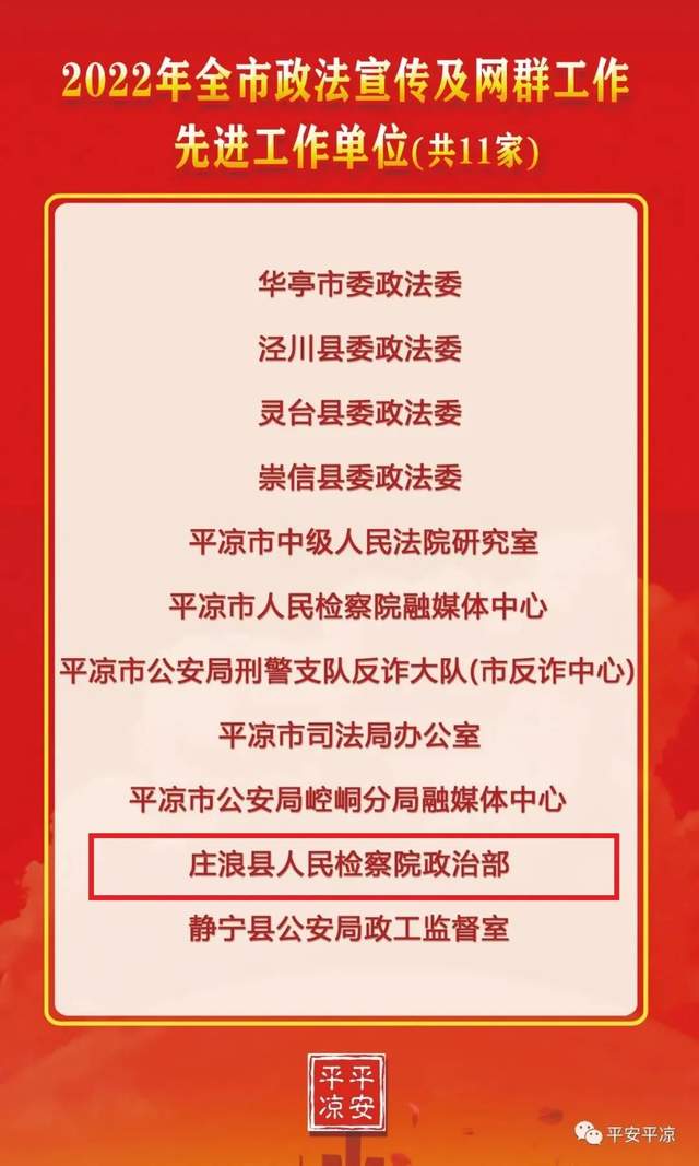 3月8日,平凉市委政法委微信公众号“平安平凉”公布2022年度全市政法宣传及网群工作先进单位和优秀通讯员荣誉榜,庄浪县人民检察院政治部获评2022年全市政法宣传及网群工作先进工作单位。